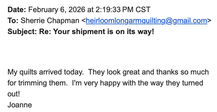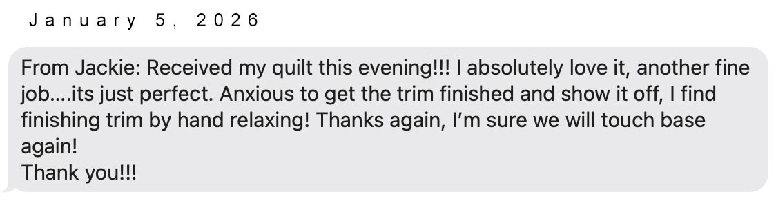 I am thrilled that I have received some very nice reviews and comments for my longarm quilting services. I know you have many choices for a longarm quilter and truly appreciate all the clients that have trusted me to work on their creations. If you like my work, or just my way of doing business, I will always welcome and appreciate a positive review or comment. If you think I could improve on something I will always welcome an email, text or phone call. I appreciate any input that could make my service better for you.